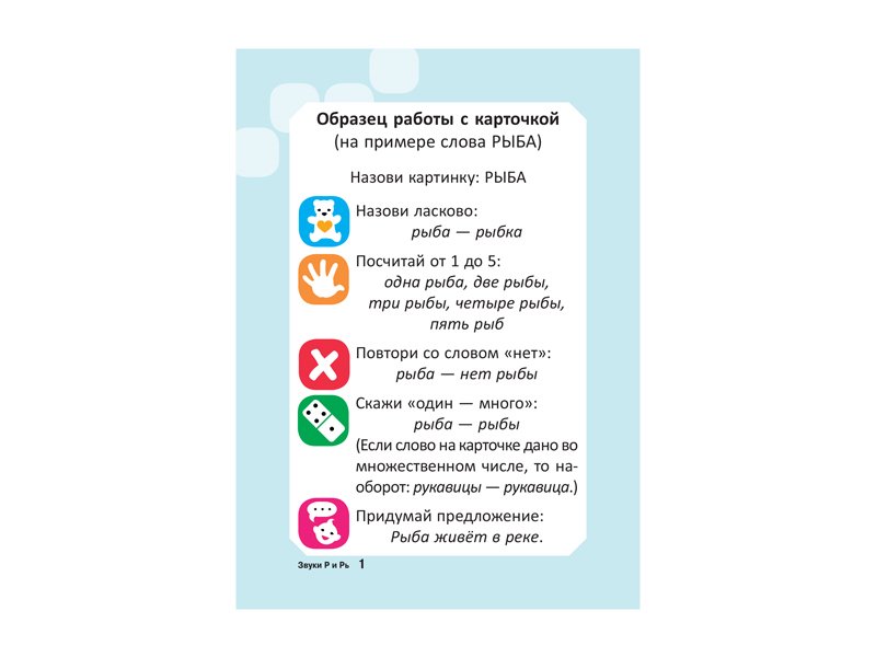 В каждом комплекте есть карточка-инструкция для родителей, где дан образец работы с карточкой и приводятся варианты различных игр для развития речи.