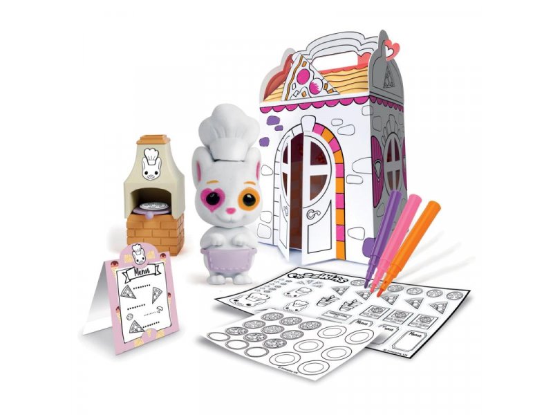 В комплекте: 1 шт. Сборный домик - "Пиццерия"; 1 шт. Флокированная фигурка; 3 шт. Смывающиеся водой фломастеры; Стикеры; Аксессуары; Инструкция