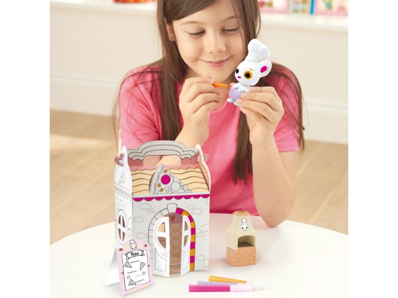 Игровой набор состоит из сборного домика Пиццерии и флокированной фигурки Мышки, которая является главном шеф-поваром пиццерии. У питомца есть все, что необходимо для приготовления настоящей пиццы: поварская шляпа и фартук, печь для пиццы и лопатка.
