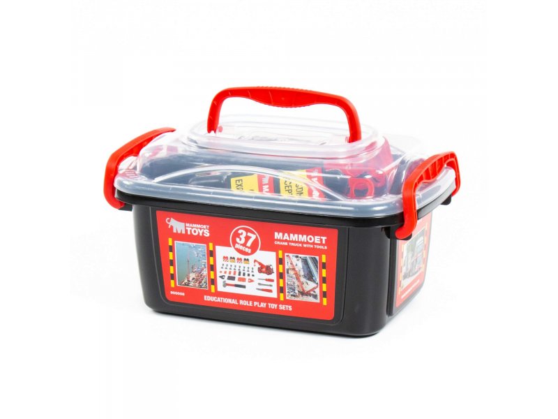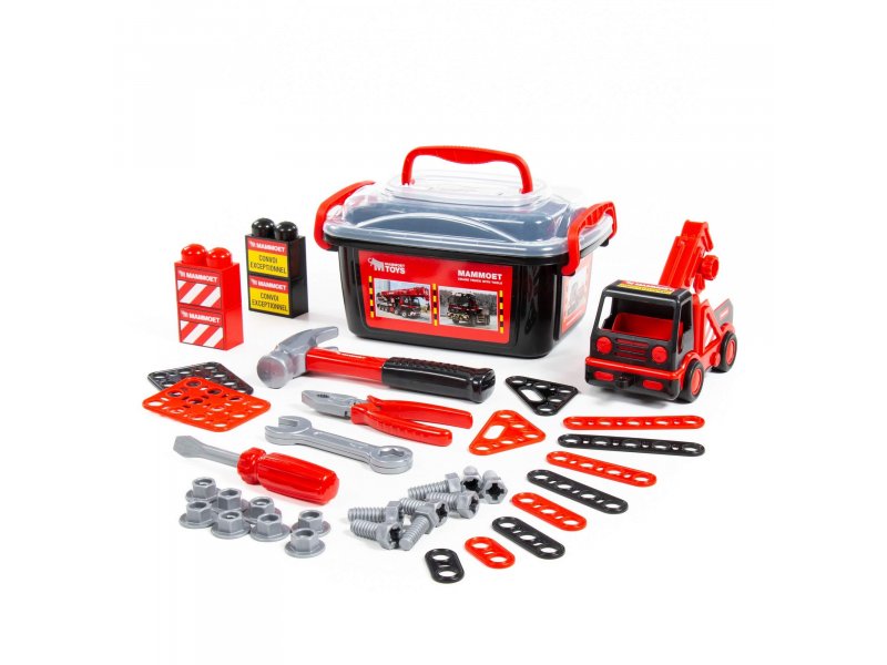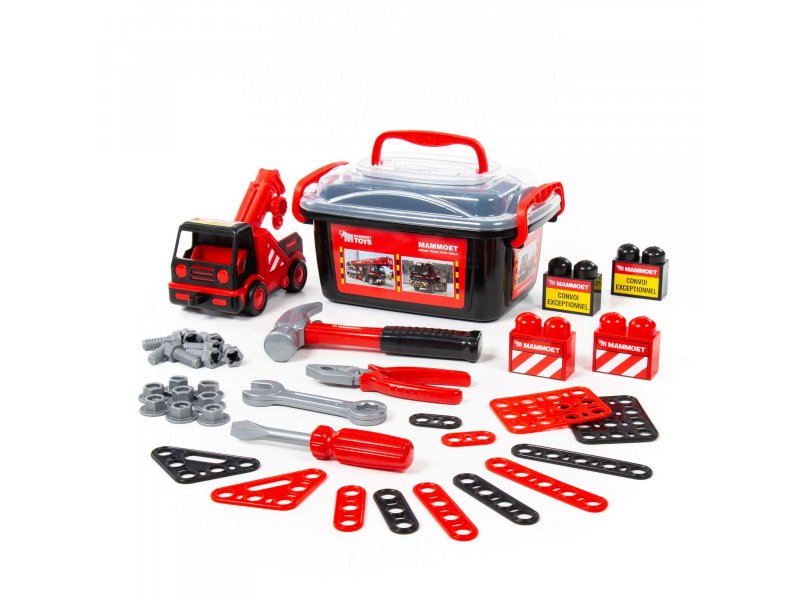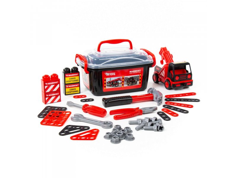 В набор конструктора входят: молоток — 1 шт., плоскогубцы — 1 шт., ключ гаечный — 1 шт., отвёртка — 1 шт., блок-конструктор — 4 шт., соединительные элементы — 12 шт., болты — 8 шт., гайки — 8 шт. Все игрушки в комплекте упакованы в пластиковом контейнере с ручками, что удобно для хранения и перемещения.