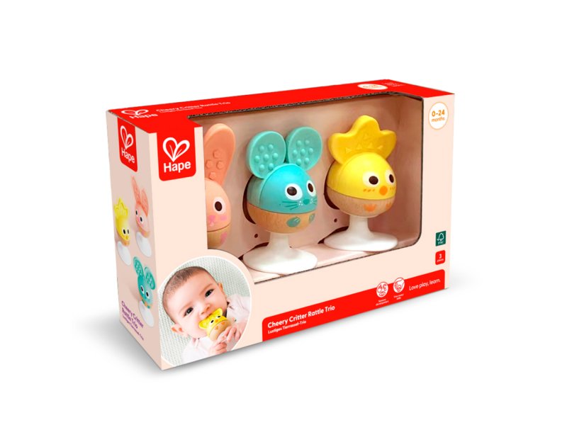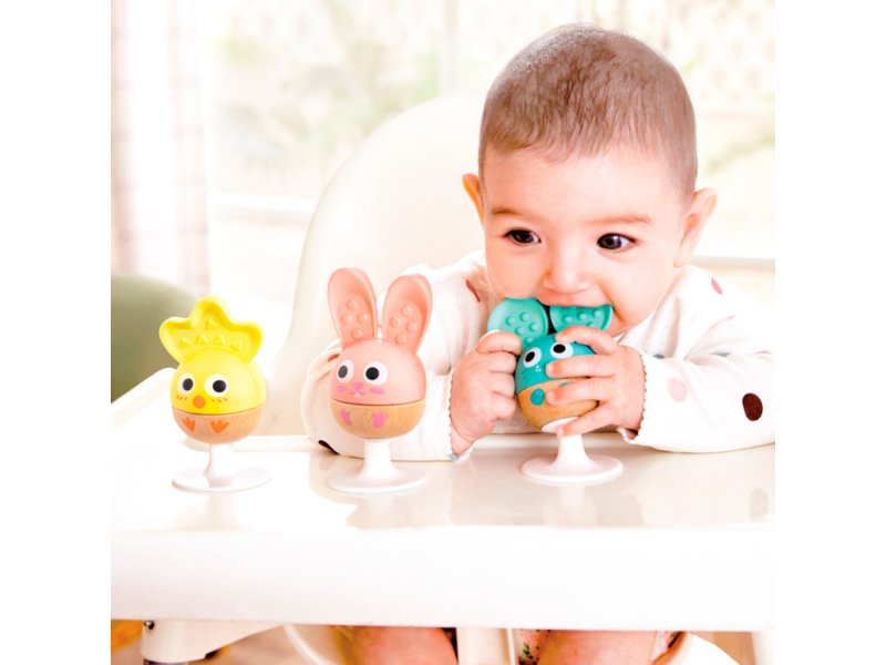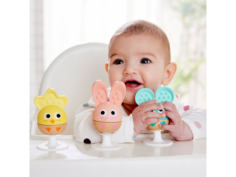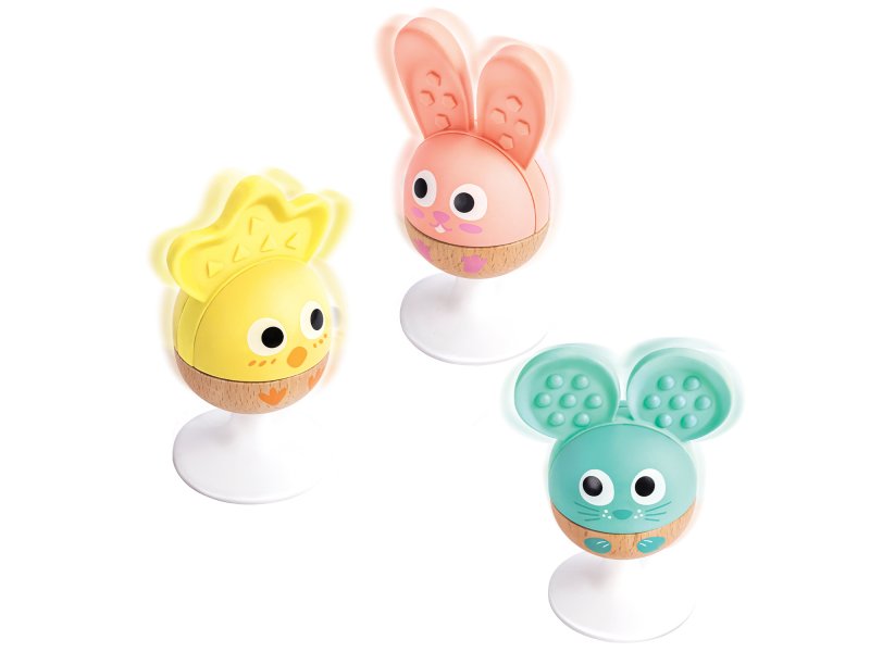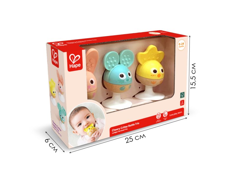 Трио погремушек - мышка, кролик и цыпленок. • Погремушки с силиконовыми ушками не только помогают массировать десны, но и улучшают моторику, восприятие и социальное взаимодействие; • Оснащены присосками, благодаря которым погремушки можно прикреплять к гладким поверхностям; • Игрушки изготовлены из бука и безопасного для детей силикона, не содержащего BPA. • Комплектация: 3 погремушки - мышка, кролик и цыпленок. • Материалы: дерево (бук), пластик (ABS), силикон. • Возрастные рекомендации: для мальчиков и девочек от 0 до 24 месяцев.