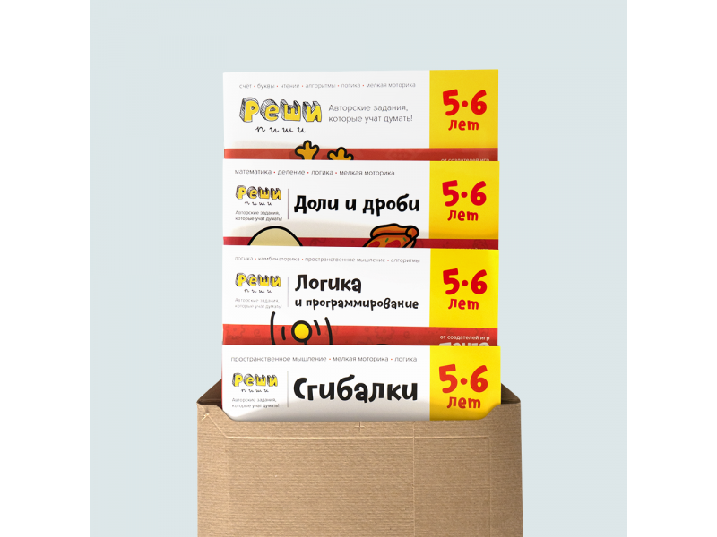 В комплекте: 4 тетради : Реши-Пиши, 5–6 лет; Сгибалки, 5-6 лет; Доли и дроби, 5-6 лет; Логика и программирование, 5-6 лет