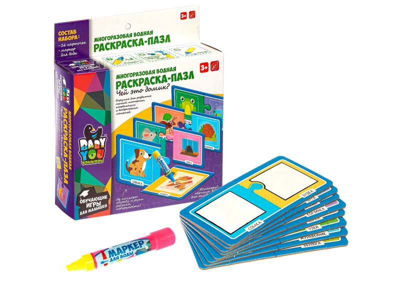 В игре "ЧЕЙ ЭТО ДОМИК?" ребенок изучает животных и названия домиков, в которых они живут. Для рисования можно использовать обычную воду, маркер не пачкает одежду и руки ребенка.
