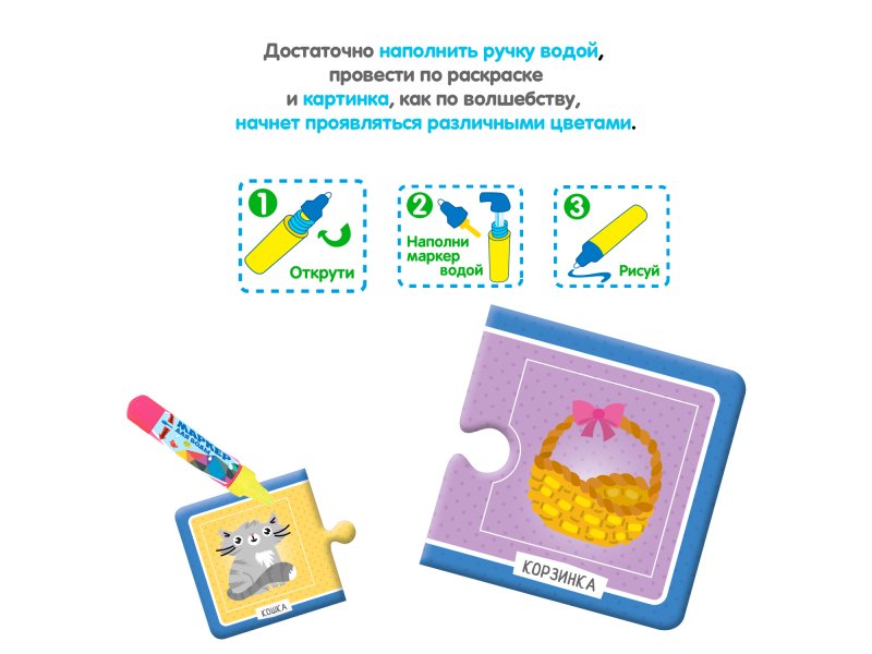 Достаточно наполнить ручку водой и провести по раскраске, и картинка, как по волшебству, начнёт проявляться различными цветами. После высыхания картинка опять становится бесцветной, и ребенок снова может раскрашивать её.