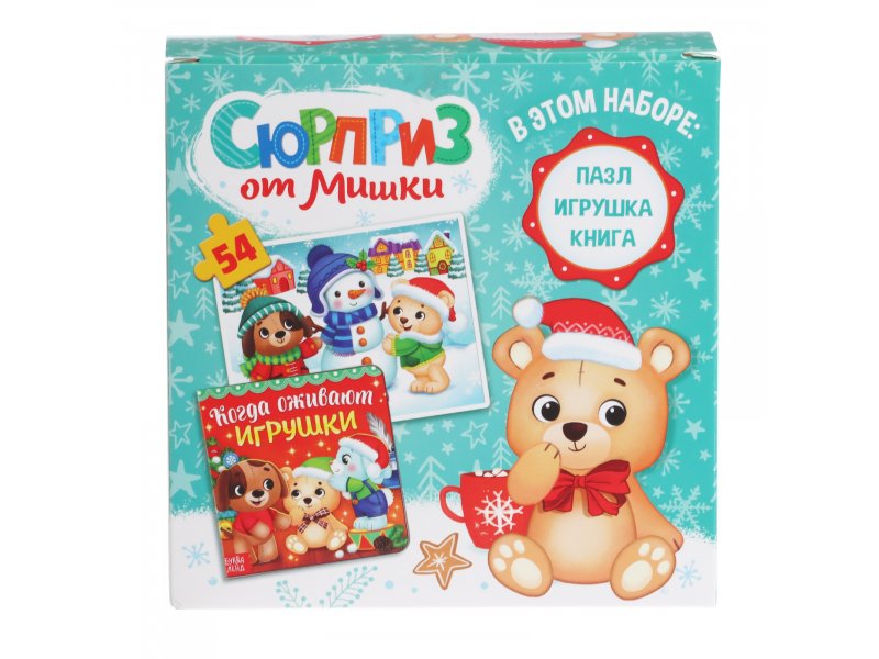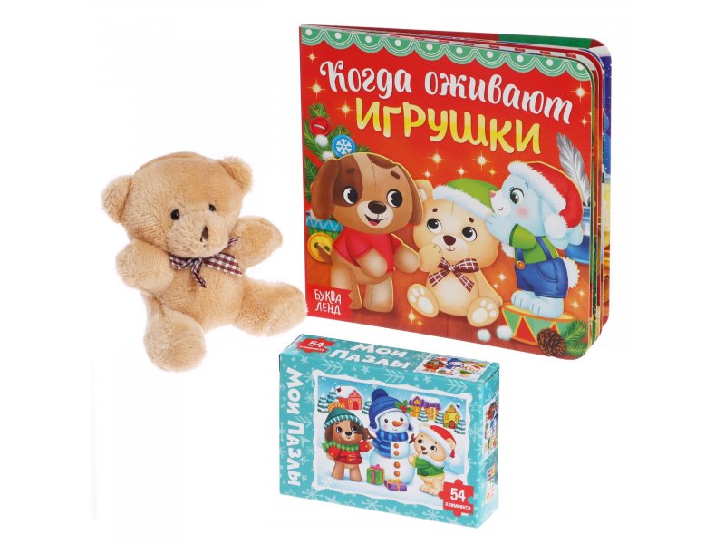 Подарочный набор с книгой, игрушкой и пазлами станет эффектным презентом для малыша. Такой набор подойдёт для индивидуального поздравления дома и для подарков от Деда Мороза в детском саду.
