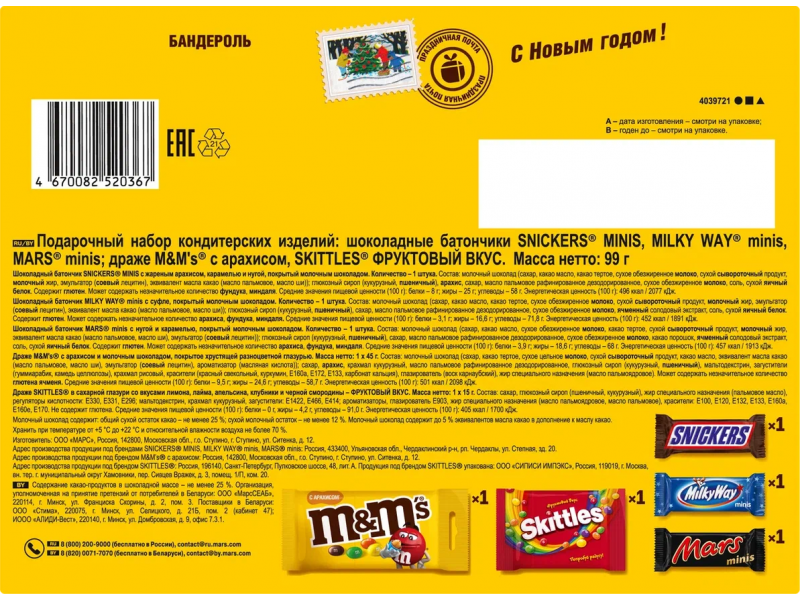 Шоколадный батончик SNICKERS® MINIS с жареным арахисом, карамелью и нугой, покрытый молочным шоколадом. Количество - 1 штука. Состав: молочный шоколад (сахар, какао масло, какао тертое, сухое обезжиренное молоко, сухой сывороточный продукт, молочный жир, эмульгатор (соевый лецитин), эквивалент масла какао (масло пальмовое, масло ши)); глюкозный сироп(кукурузный,пшеничный), арахис, сахар, масло пальмовое рафинированное дезодорированное, сухое обезжиренное молоко, соль, сухой яичный белок. Cодержит глютен. Может содержать незначительное количество фундука, миндаля. Средние значения пищевой ценности (100 г): белки – 8 г; жиры – 25 г; углеводы – 58 г. Энергетическая ценность (100 г): 496 ккал / 2077 кДж.Шоколадный батончик MILKY WAY® minis с суфле, покрытый молочным шоколадом. Количество - 1 штука. Состав: молочный шоколад (сахар, какао масло, какао тертое, сухое обезжиренное молоко, сухой сывороточный продукт, молочный жир, эмульгатор (соевый лецитин), эквивалент масла какао (масло пальмовое, масло ши)); глюкозный сироп (кукурузный, пшеничный), сахар, масло пальмовое рафинированное дезодорированное, сухое обезжиренное молоко, ячменный солодовый экстракт, соль, сухой яичный белок. Содержит глютен. Может содержать незначительное количество арахиса, фундука, миндаля. Средние значения пищевой ценности (100 г): белки – 3,1 г; жиры – 16,6 г; углеводы – 71,8 г. Энергетическая ценность (100 г): 452 ккал / 1891 кДж. Шоколадный батончик MARS® minis с нугой и карамелью, покрытый молочным шоколадом. Количество – 1 штука. Состав: молочный шоколад (сахар, какао масло, сухое обезжиренное молоко, какао тертое, сухой сывороточный продукт, молочный жир, эквивалент масла какао (масло пальмовое, масло ши), эмульгатор (соевый лецитин)); глюкозный сироп (кукурузный, пшеничный), сахар, масло пальмовое рафинированное дезодорированное, сухое обезжиренное молоко, какао порошок, ячменный солодовый экстракт, соль, сухой яичный белок. Содержит глютен. Может содержать незначительное количество арахиса, фундука, миндаля. Средние значения пищевой ценности (100 г): белки – 3,9 г; жиры – 18,6 г; углеводы – 68 г. Энергетическая ценность (100 г): 457 ккал / 1913 кДж.Драже M&M's® c арахисом и молочным шоколадом, покрытое хрустящей разноцветной глазурью. Масса нетто: 1 х 45 г. Состав: молочный шоколад (сахар, какао тертое, сухое цельное молоко, сухой сывороточный продукт, какао масло, эквивалент масла какао (масло пальмовое, масло ши), эмульгатор (соевый лецитин), ароматизатор (масляная кислота)); сахар, арахис, крахмал кукурузный, масло пальмовое рафинированное дезодорированное, глюкозный сироп (кукурузный, пшеничный), мальтодекстрин, загустители (гуммиарабик, камедь целлюлозы), крахмал рисовый, красители (красный свекольный, куркумин, Е160а, Е172, Е133, карбонат кальция), глазирователь (воск карнаубский), жир специального назначения (масло пальмоядровое). Может содержать незначительное количество глютена ячменя. Средние значения пищевой ценности (100 г): белки – 9,5 г; жиры – 24,6 г; углеводы – 58,7 г. Энергетическая ценность (100 г): 501 ккал / 2098 кДж. Драже SKITTLES® в сахарной глазури со вкусами лимона, лайма, апельсина, клубники и черной смородины - ФРУКТОВЫЙ ВКУС. Масса нетто: 1 х 15 г.Состав: сахар, глюкозный сироп (пшеничный, кукурузный), жир специального назначения (пальмовое масло), регуляторы кислотности: Е330, Е331, Е296; мальтодекстрин, крахмал кукурузный, загустител