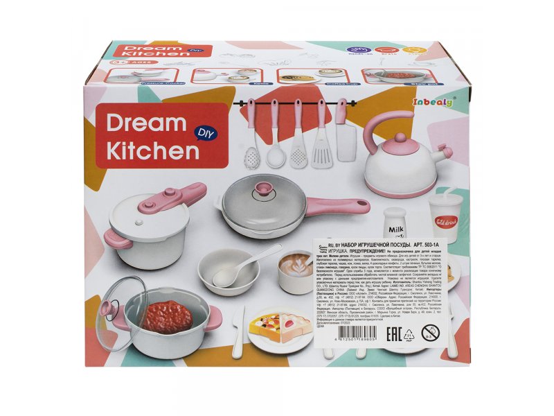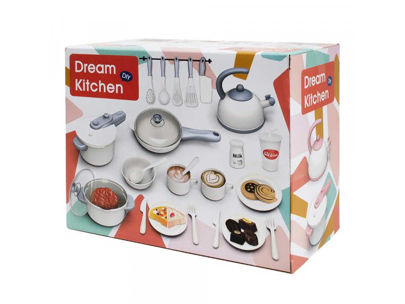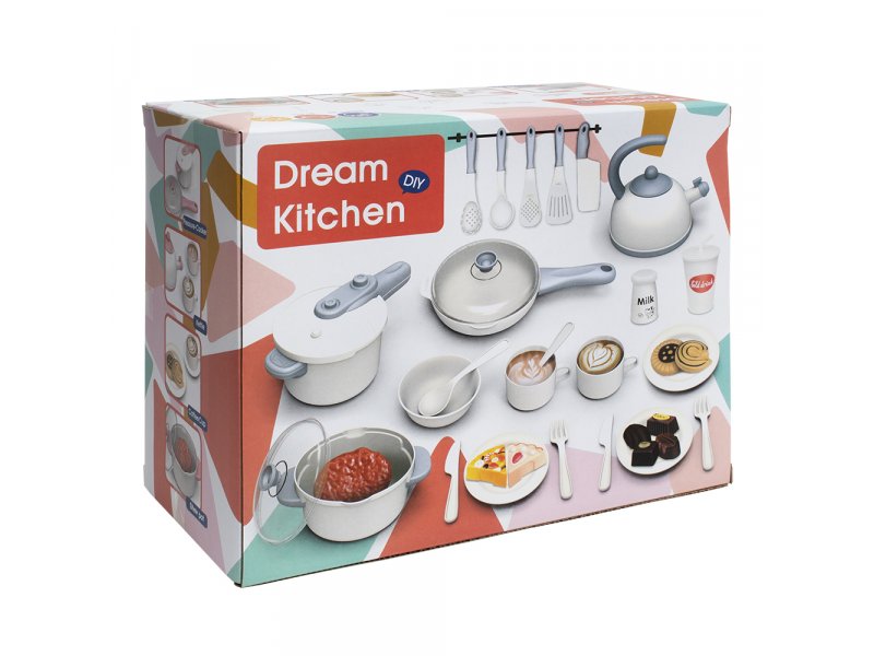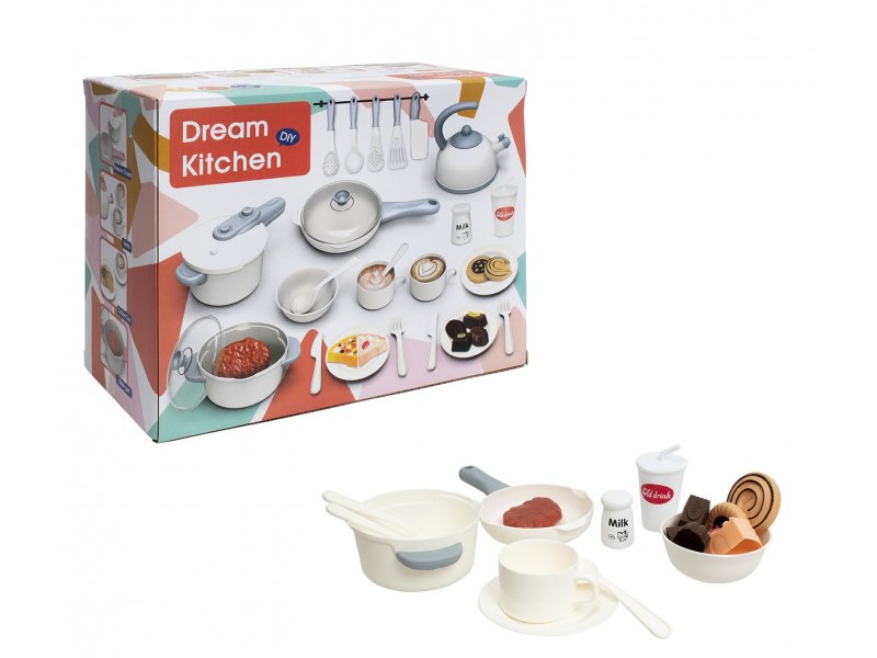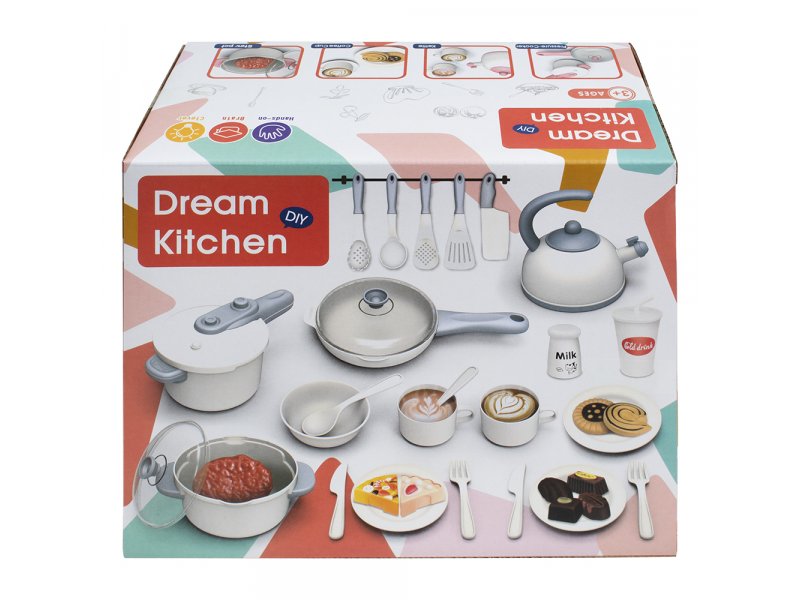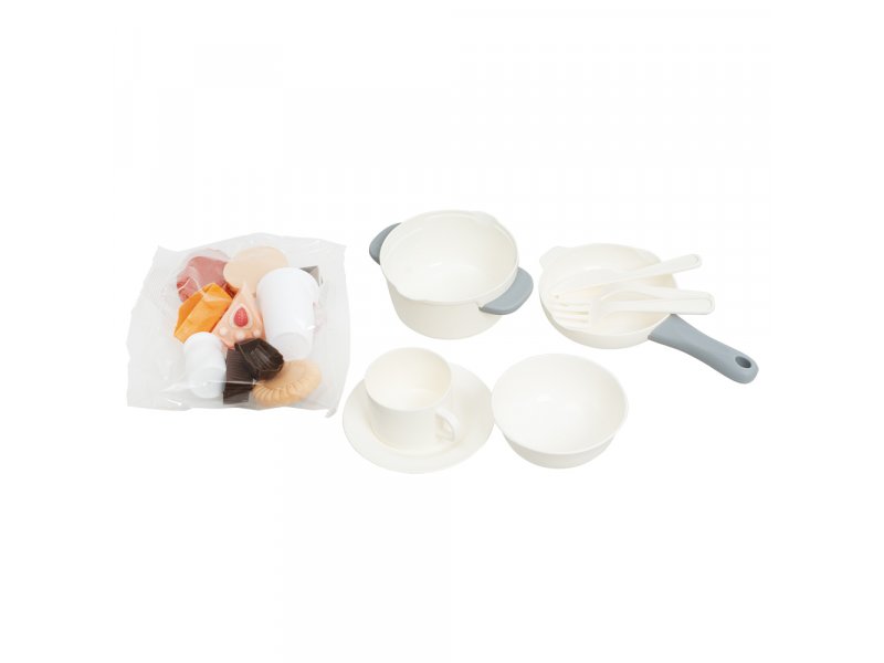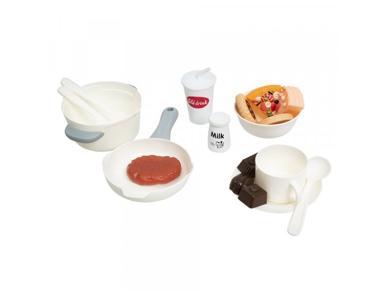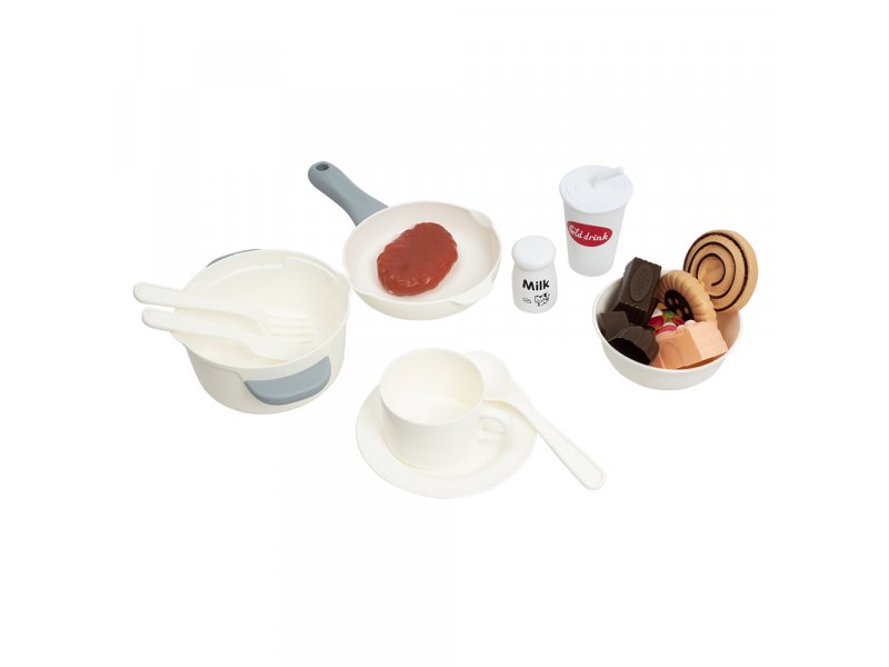 Комплектность: сковорода, кастрюля, плоская тарелка, глубокая тарелка, чашка, нож, ложка, вилка, 4 шоколадных конфеты, 2 штуки печенья, бутылка молока, стакан лимонада, говядина, кусок пиццы, кусок торта.