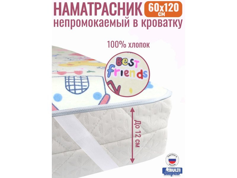 Наматрасник в детскую кроватку 120*60 с резинками по углам бренда MULTI-DIAPERS продлит срок службы матраса, защитит его от влаги, пятен и загрязнений.