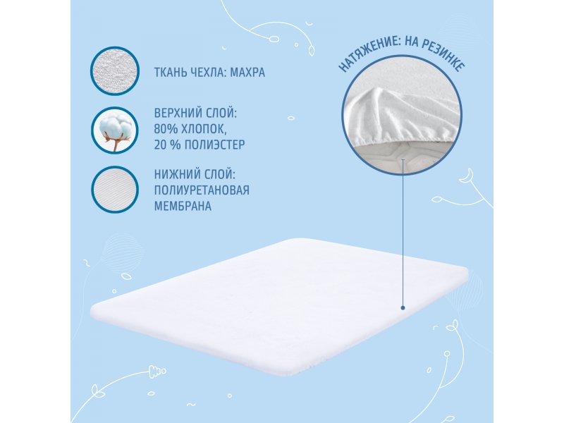 Слои наматрасника прочно соединены между собой при помощи способа горячей фиксации Hot-Melt, при котором не требуется применения клея. Хорошая воздухопроницаемость полотна не создает «парникового эффекта» и идеально поддерживает естественную терморегуляцию тела ребенка. Влагостойкая мембрана полностью защищает от протекания и ускоряет срок высыхания наматрасника.