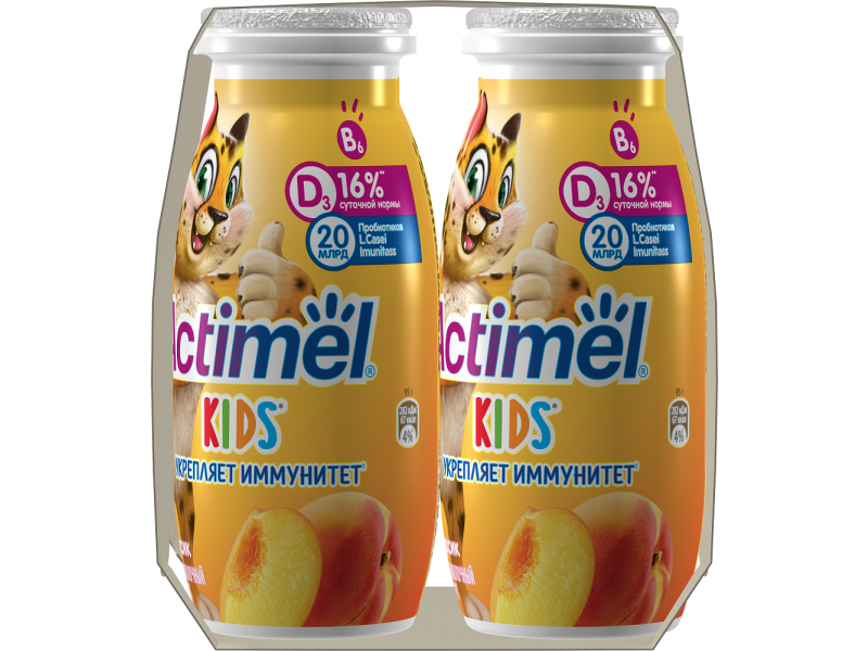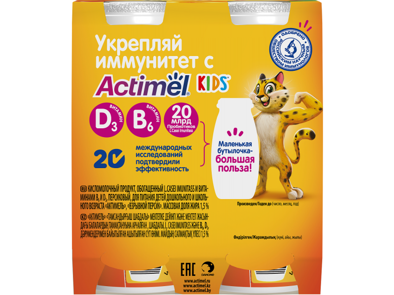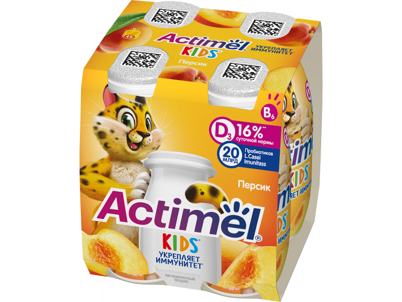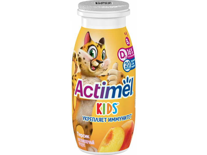 Actimel – это один из самых доступных способов ежедневного укрепления иммунитета, ведь в такой маленькой бутылочке содержатся 20 миллиардов пробиотиков L.Casei Imunitass и витамины B6, D3. Укрепите иммунитет ребёнка с детским Actimel со вкусом Персика!