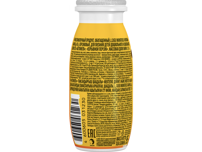 Состав: Молоко обезжиренное, вода, сахар, сливки, наполнитель (вода; глюкозно-фруктозный сироп; концентрированное персиковое пюре; стабилизатор – Е1442; ароматизатор натуральный; регуляторы кислотности – лимонная кислота, цитраты натрия; краситель – каротины, витамин D3), молоко сухое обезжиренное, глюкоза, йогуртовая закваска, лактобактерии L. CASEI IMUNITASS, витамин D3, витамин B6. Количество молочнокислых микроорганизмов – не менее 1х107 КОЕ/г. Количество L. CASEI IMUNITASS – не менее 2х108 КОЕ/г.