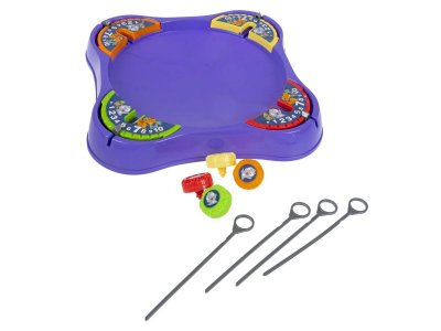 В набор входят: игровая арена, 4 волчка, 4 запускающих прутика, набор наклеек.