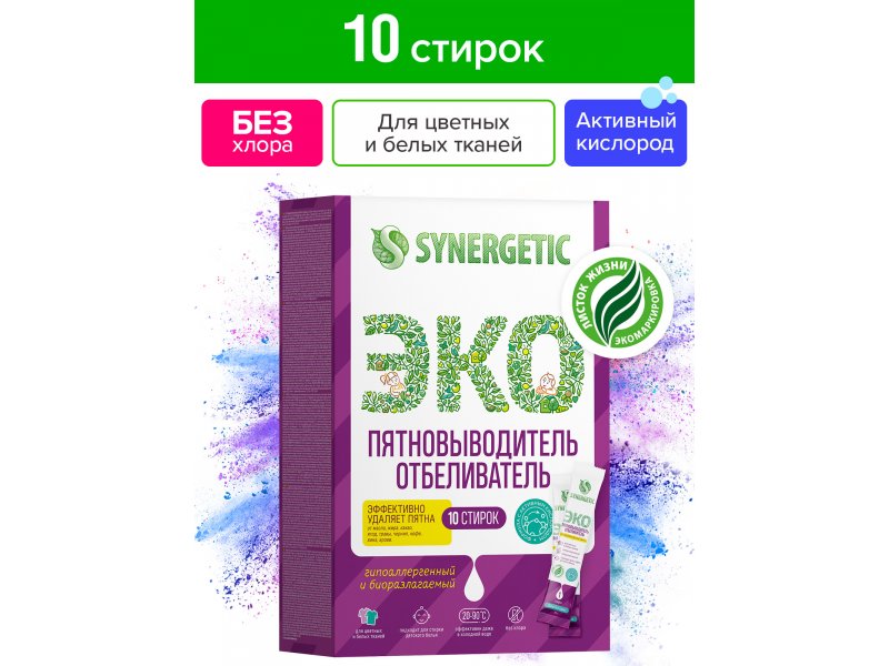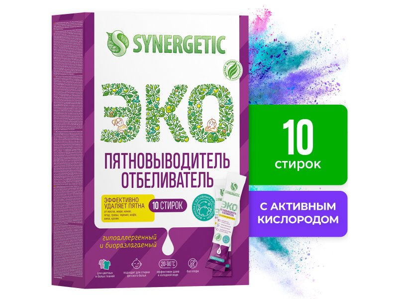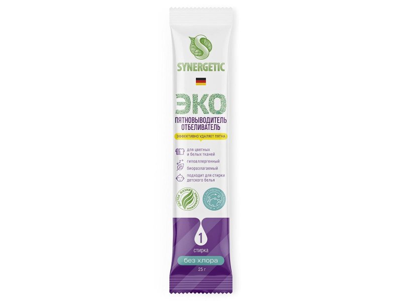 Биоразлагаемый гипоаллергенный пятновыводитель-отбеливатель с активным кислородом SYNERGETIC в стиках - универсальное средство для эффективного удаления загрязнений и трудновыводимых пятен с тканей даже в холодной воде.