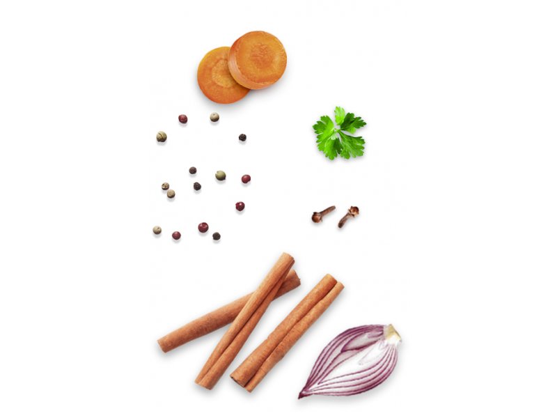 Состав: мясо индейки, масло подсолнечное, сердце говяжье, пюре из моркови, лук, мука рисовая, молоко сухое, соль, перец чёрный, корица, гвоздика, вода.