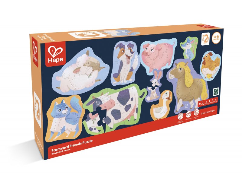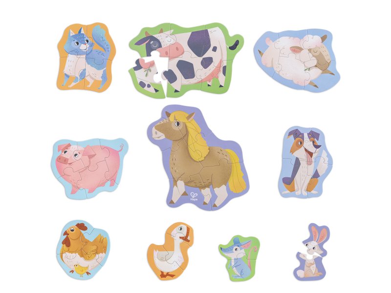 Набор включает 10 сборных картинок животных - обитателей фермы, каждая картинка состоит из небольшого количества элементов (от 6 до 2-х), что позволяет ребёнку достаточно быстро достигать желаемого результата и не терять концентрацию.