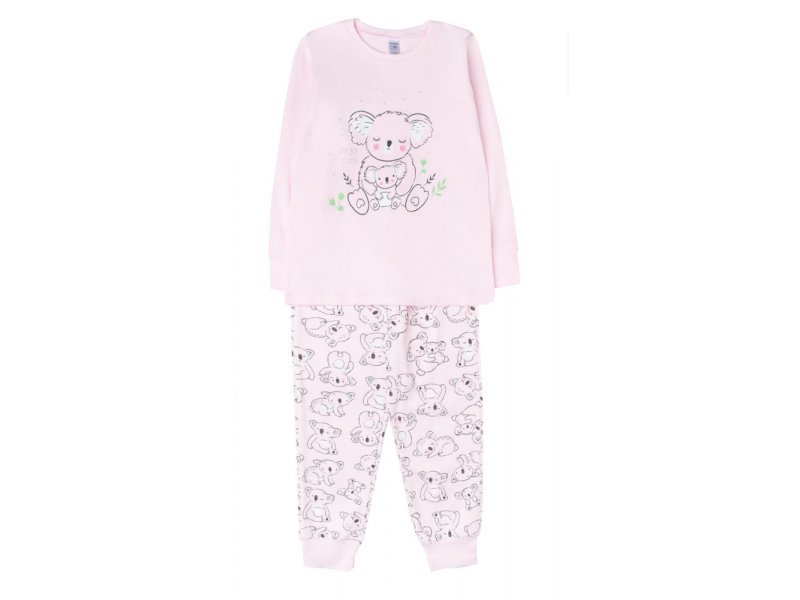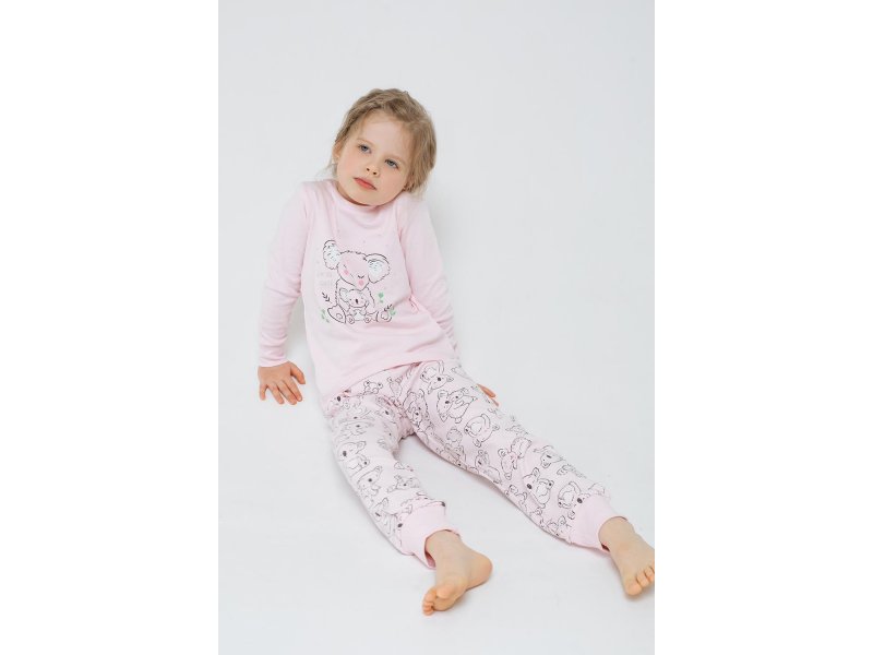Пижама для девочки Crockid в нежно-розовом цвете с забавными коалами. Пижамаиз мягкого трикотажа интерлок пенье. Однотонный джемпер с принтом и брюки с набивным рисунком. На рукавах джемпера - широкие манжеты, низ обработан плоскими швами. В брюках эластичный пояс на резинке и мягкие манжеты.
