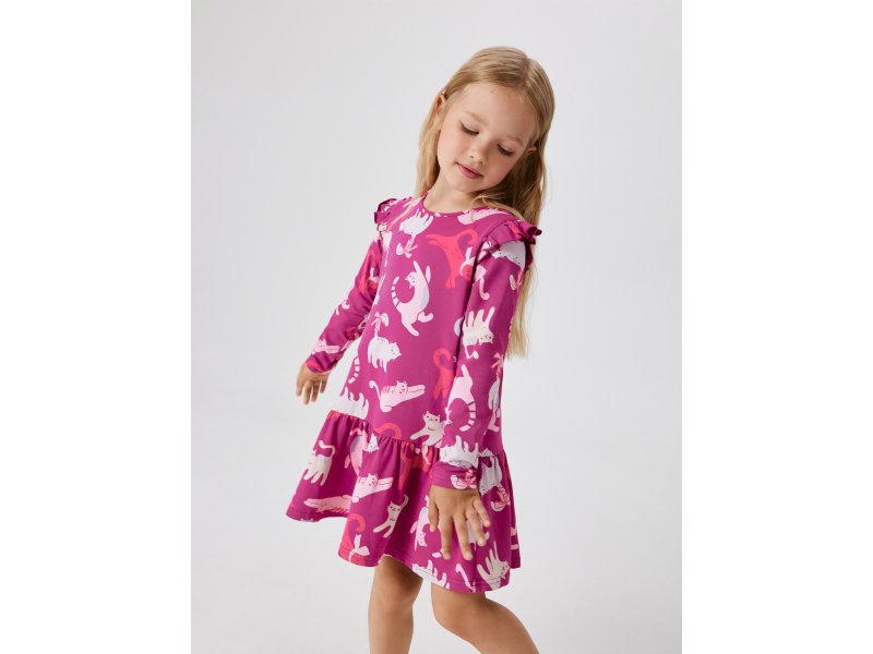 Детское платье с принтом котиков для девочки изготовлено из мягкой трикотажной ткани с принтом. Платье свободного силуэта комфортно садится на разные типы фигур и дарить большую свободу движений, которую так ценят активные непоседы. Длинные рукава делают модель подходящей для прохладной погоды. Отрезная юбка, пришитая ниже линии талии, присборена у шва, благодаря чему подол с мягкими складками придает утонченный акцент. Плечи дополнены нежными декоративными крылышками, которые делают юную модницу похожей на настоящую принцессу. Принт в виде котиков придает образу игривости и яркости. Стилизуйте платье летом с любимыми сандалиями, а в прохладное время года - с яркими колготками в тон.