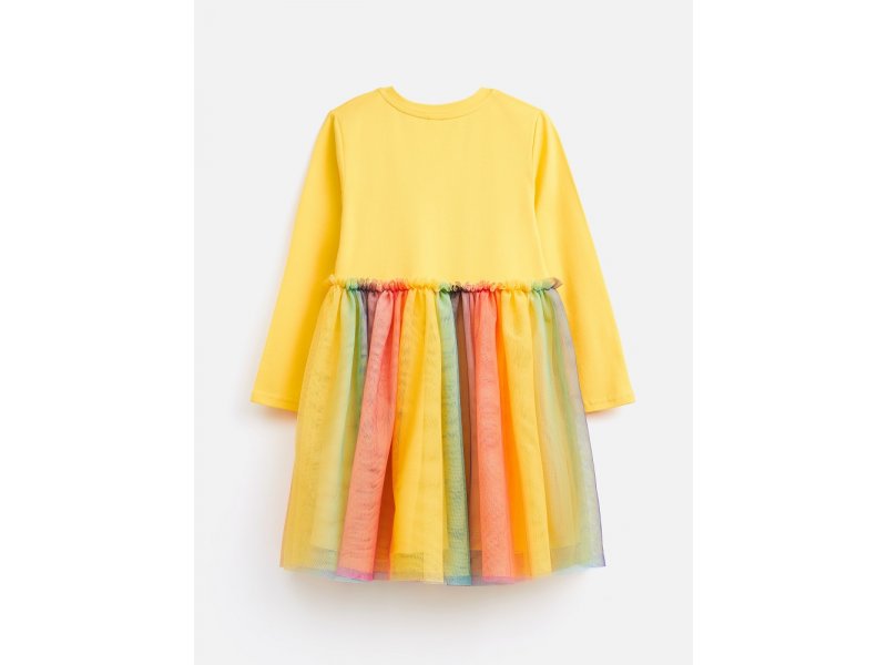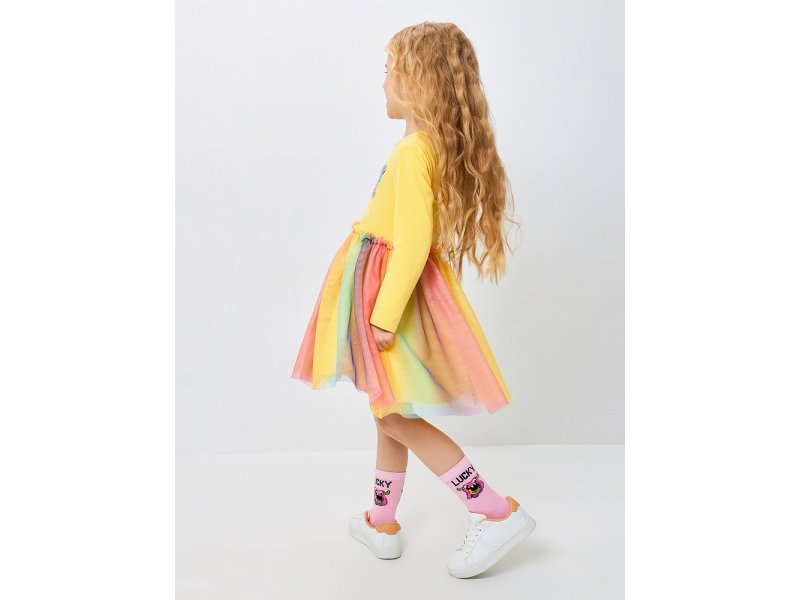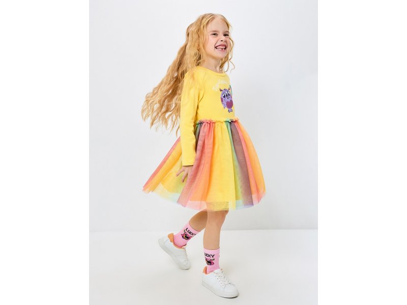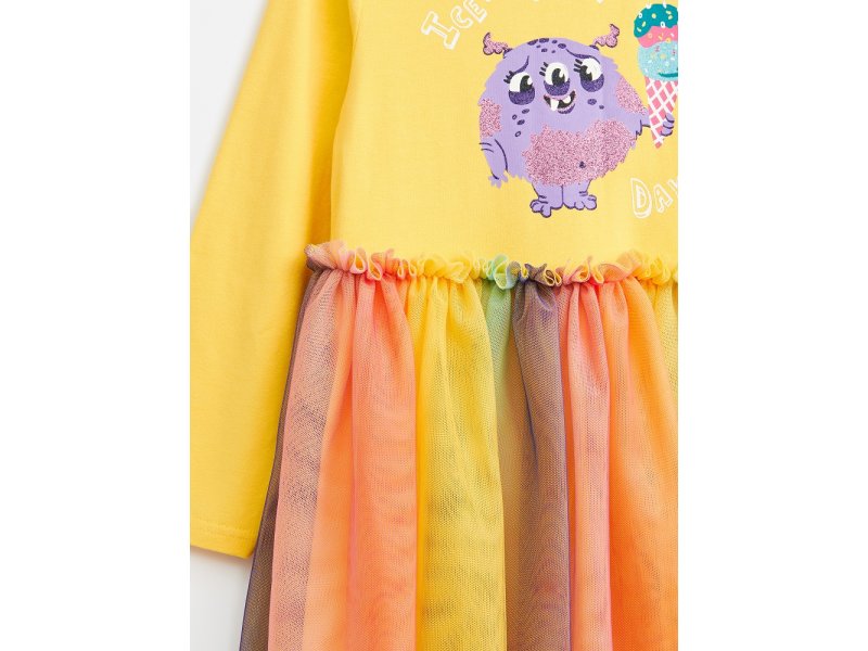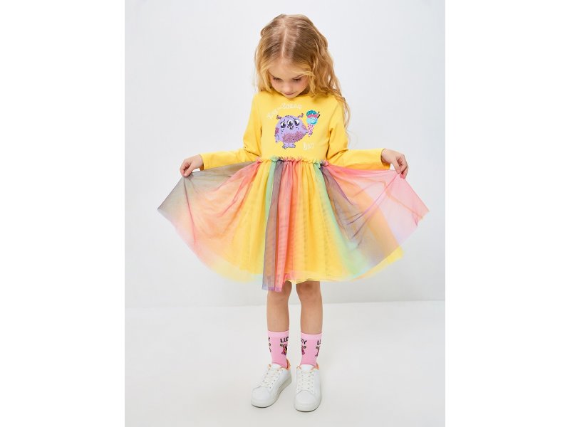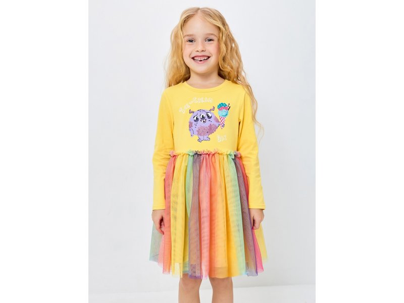 Трикотажное платье для девочки с настрочной юбкой из сетки и рюшами по линии талии. Рукав втачной. Перед изделия украшен принтом.