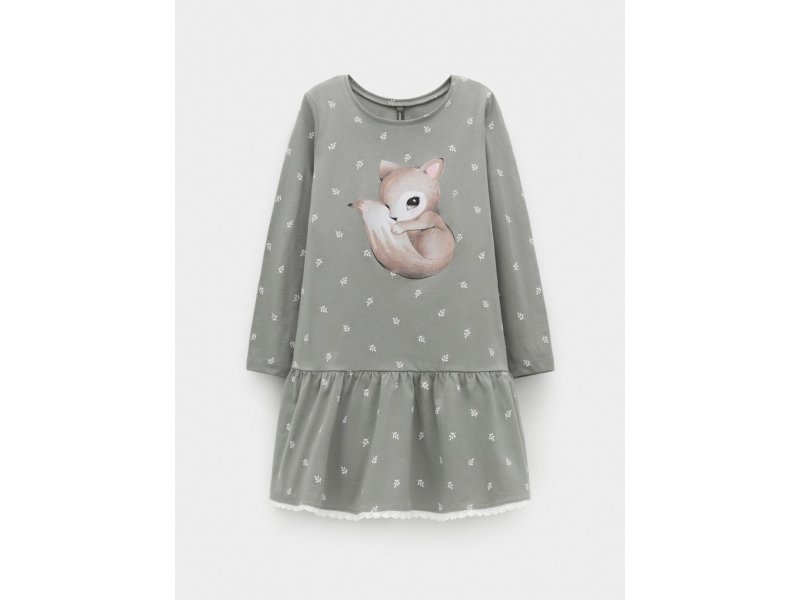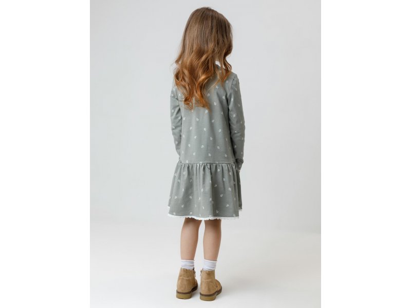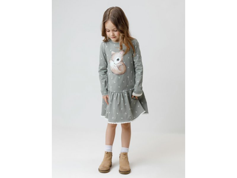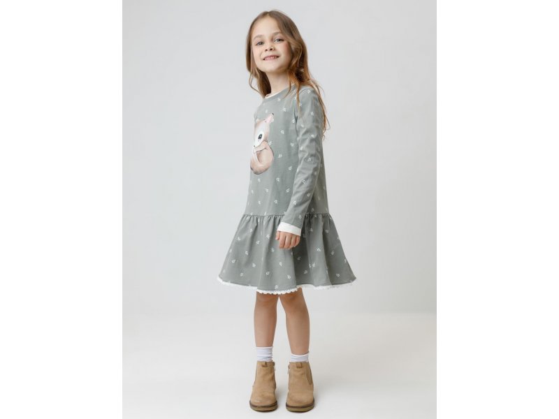 Платье с оборкой для девочки. Изготовлено из высококачественного гладкого трикотажа, произведённого из натурального хлопка. Застёгивается на кнопки в размерах 92 и 98. Оригинальный рисунок выполнен из стойких текстильных гипоаллергенных красителей. Изделие сохраняет цвет и форму после многократных стирок. Все трикотажные полотна производятся в соответствии с нормами швейцарского сертификата ЭкоТекс.