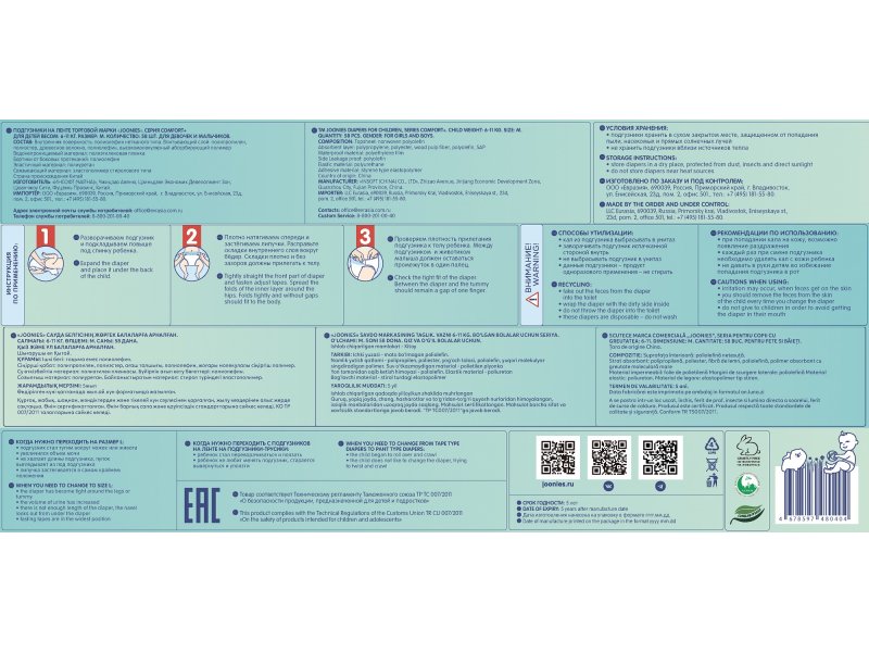 Подгузники-трусики Joonies Comfort - это подгузники отличного качества по доступной цене! Милые мордочки зверят на подгузниках порадуют и маму и малыша. А какие они фотогеничные!) Внутренняя 3D поверхность сокращает площадь касания подгузника с кожей ребенка, улучшает воздухообмен, что помогает избежать раздражений и опрелостей. Впитывающий слой из двухслойного суперабсорбента надежно удерживает влагу внутри подгузника и сохраняет кожу малышей сухой длительное время. Трусики T-формы. Полоски-индикаторы сменят цвет и подскажут, когда пора сменить подгузник.