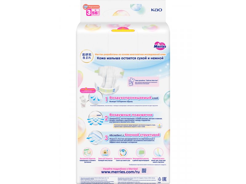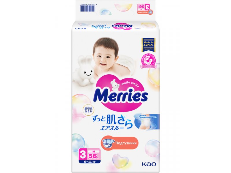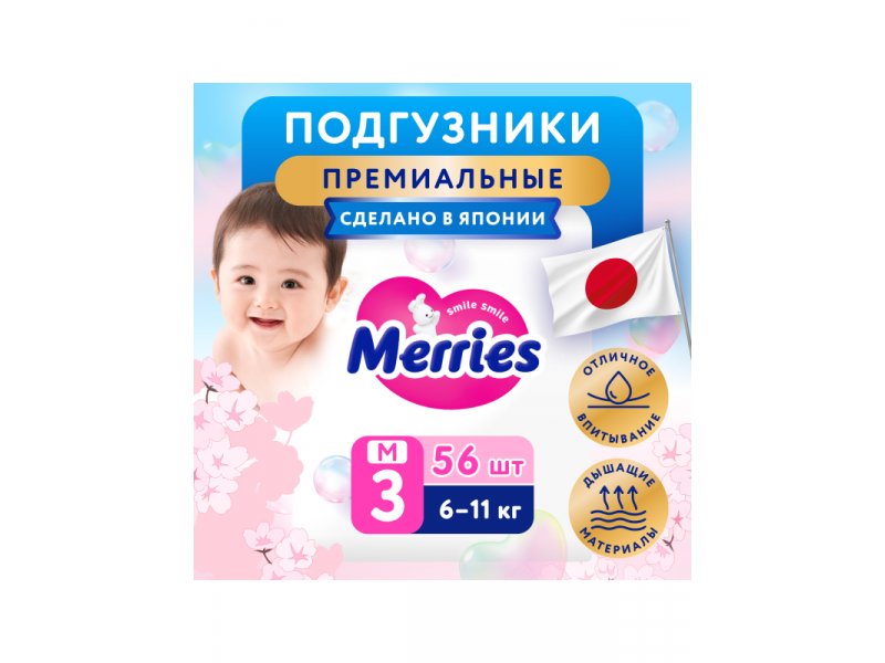 Подгузники Merries размер M 6-11 кг, 56 шт.