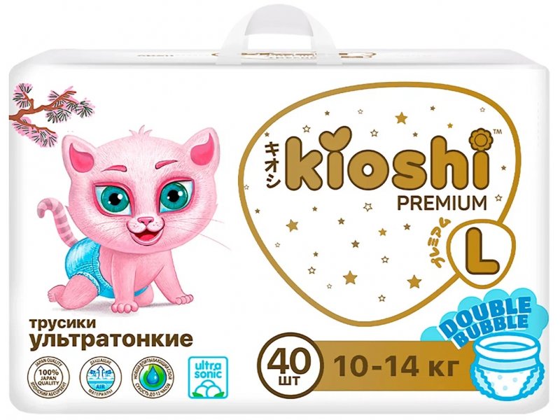 Ультратонкие KIOSHI PREMIUM подгузники-трусики L подходят для детей весом 10-14 кг, 40 штук в упаковке. Памперсы и детские трусики ультратонкие KIOSHI имеют 2 слоя японского абсорбента, который закреплен нано-нитями. Благодаря этой технологии абсорбент не скапливается в одном месте, а равномерно распределяется и превращается в гель. В линейке PREMIUM на 10% больше абсорбента внутри. Трусики не провисают и не комкуются между ножек. Q-shape форма трусиков создает дополнительную защиту от протекания у ножек и бедер, а также усиливает 3D эффект внутри, который защищает от боковых протеканий. Японские подгузники KIOSHI не стесняют движений малыша. Мягкий поясок-embrace и бортики-манжеты у ножек нежно обхватывают тело, словно мамины объятия. Удобные не только для малыша, но и для мамы: индикатор наполнения подскажет, когда нужно сменить памперс, боковые швы легко можно разорвать, чтобы быстро снять уже заполненные трусики и лента для утилизации, с помощью которой можно аккуратно свернуть трусики.