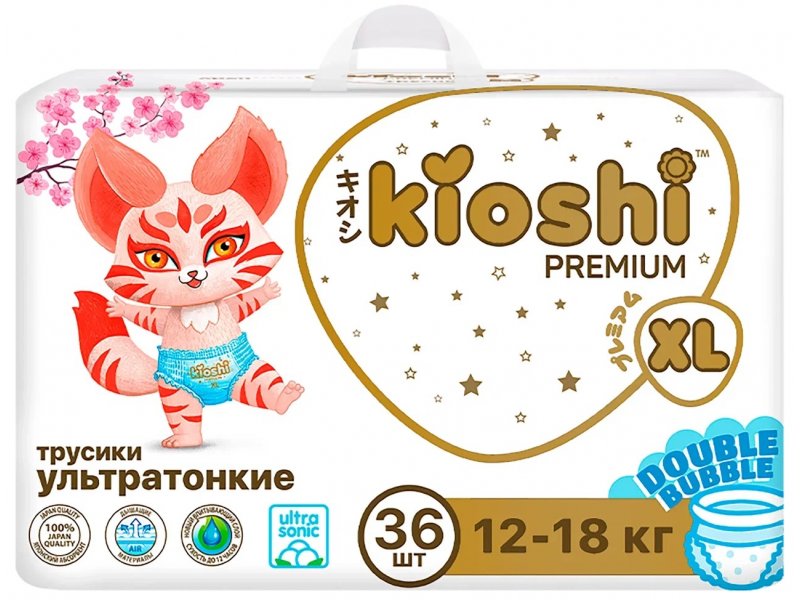 Ультратонкие KIOSHI PREMIUM подгузники-трусики XL подходят для детей весом 12-18+ кг, 36 штук в упаковке. Памперсы и детские трусики ультратонкие KIOSHI имеют 2 слоя японского абсорбента, который закреплен нано-нитями. Благодаря этой технологии абсорбент не скапливается в одном месте, а равномерно распределяется и превращается в гель. В линейке PREMIUM на 10% больше абсорбента внутри. Трусики не провисают и не комкуются между ножек. Q-shape форма трусиков создает дополнительную защиту от протекания у ножек и бедер, а также усиливает 3D эффект внутри, который защищает от боковых протеканий. Японские подгузники KIOSHI не стесняют движений малыша. Мягкий поясок-embrace и бортики-манжеты у ножек нежно обхватывают тело, словно мамины объятия. Удобные не только для малыша, но и для мамы: индикатор наполнения подскажет, когда нужно сменить памперс, боковые швы легко можно разорвать, чтобы быстро снять уже заполненные трусики и лента для утилизации, с помощью которой можно аккуратно свернуть трусики.