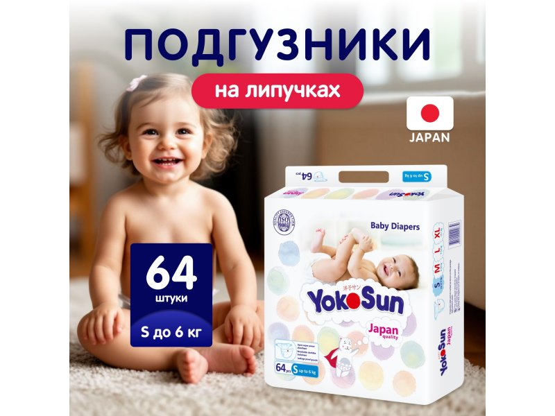 Подгузники YokoSun S до 6 кг, 64 шт
