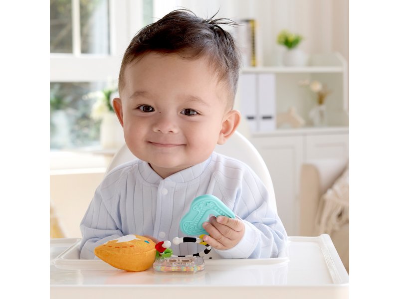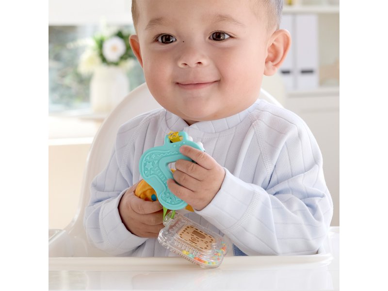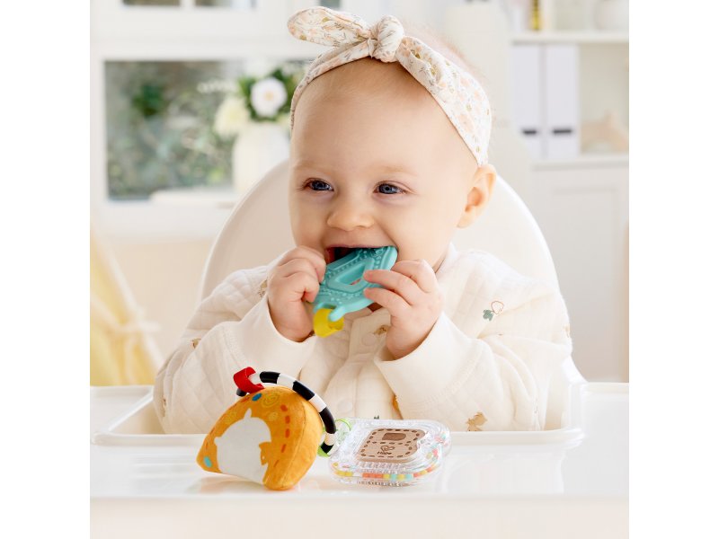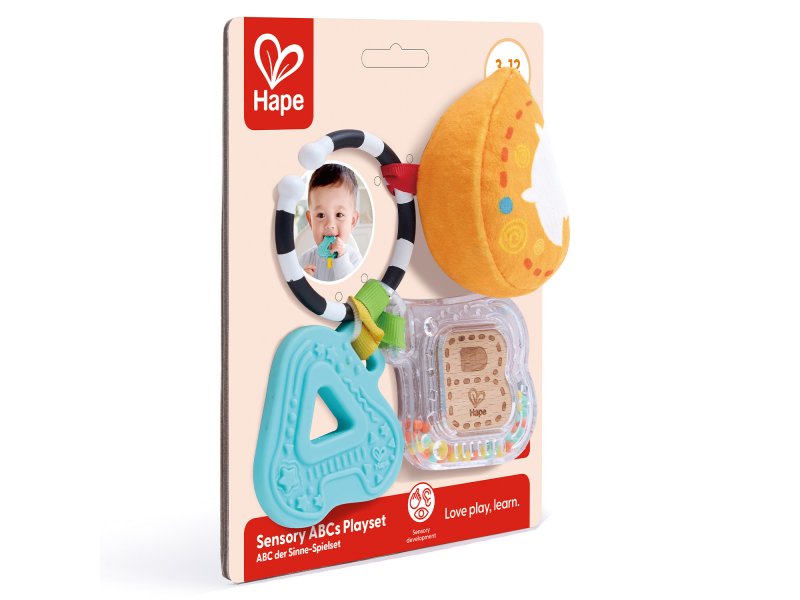 Сенсорная развивающая игрушка ABC объединяет в себе прорезыватель, звенящую погремушку и мягкую игрушку. Все элементы игрушки предназначены для тренировки органов чувств малыша и его знакомства с формами и цветами.