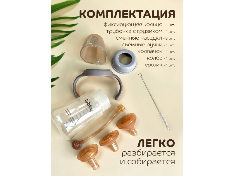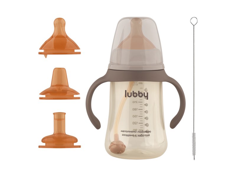 Поильник Lubby 3в1 с носиком, трубочка, соска молочная и ёршик, от 0 мес., сил., 300мл