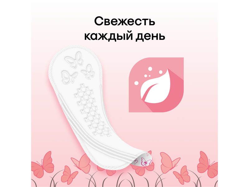 Оригинальное надёжное тиснение по краям прокладки препятствует её расслоению, а женственные узоры в виде бабочек добавят удовольствия при использовании ежедневных прокладок Kotex Нормал!