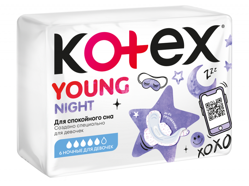 Прокладки Kotex Young Ночные гигиенические для девочек, 6 шт