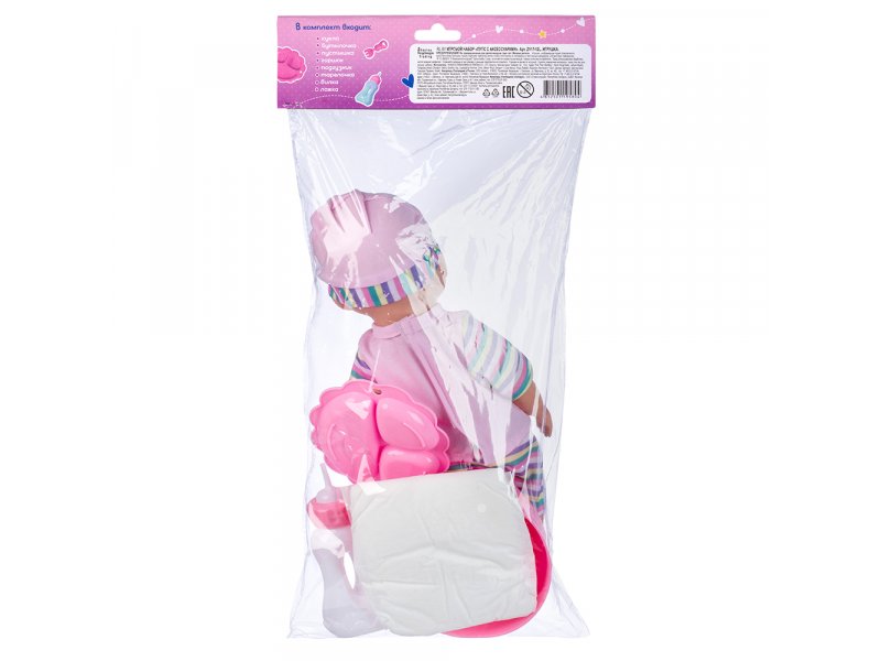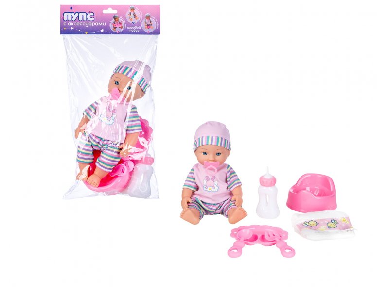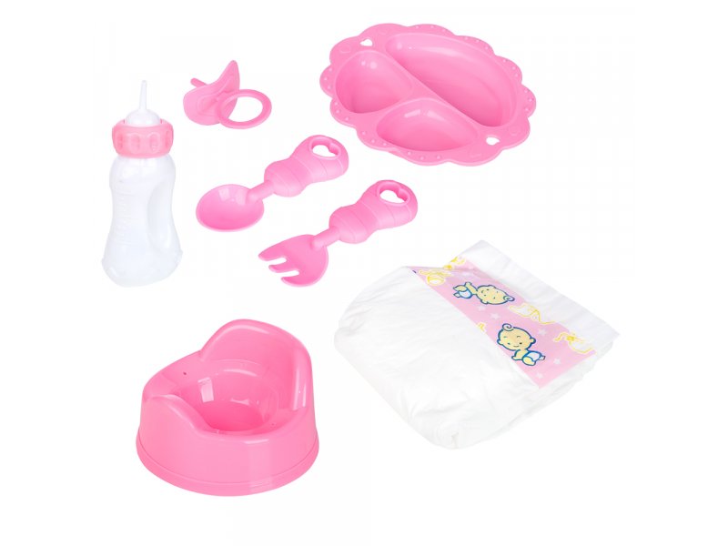 В комплекте есть множество аксессуаров для сюжетно-ролевых игр с куклой: бутылочка, пустышка, горшок, подгузник, тарелочка, вилка и ложка.