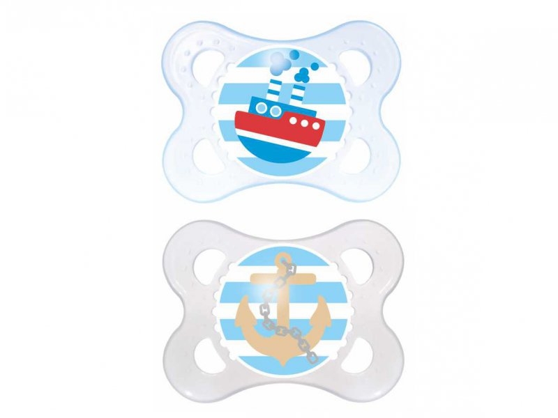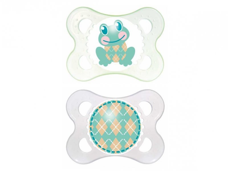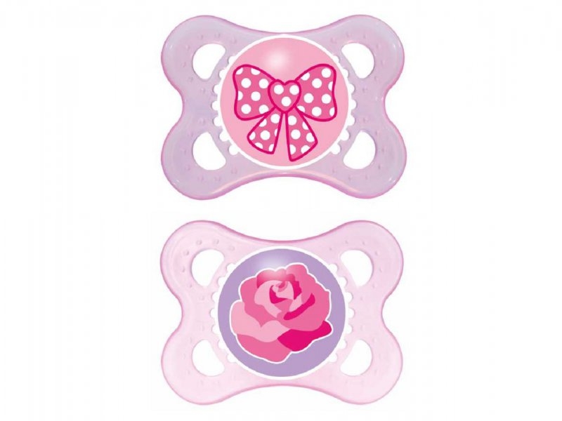 Ортодонтическая форма идеально способствует формированию правильного прикуса. Эластичное основание пустышки с отверстиями, способствует циркуляции воздуха и не раздражает нежную кожу малыша. Пустышки упакованы в контейнер, который в дальнейшем можно использовать для их хранения.
