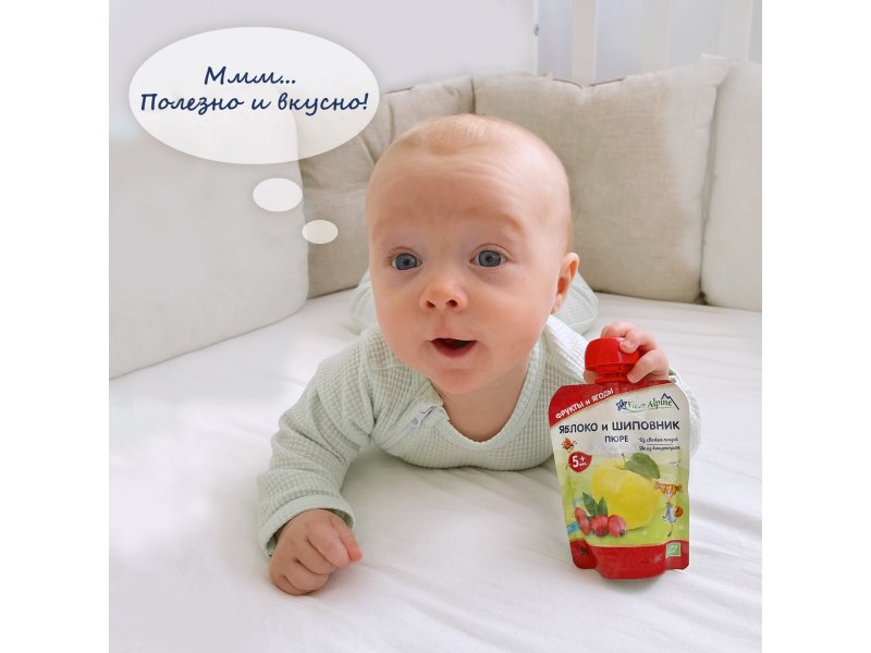 Детское пюре Fleur Alpine ORGANIC ЯБЛОКО И ШИПОВНИК производится из гипоаллергенных сортов яблок и органических плодов шиповника.
