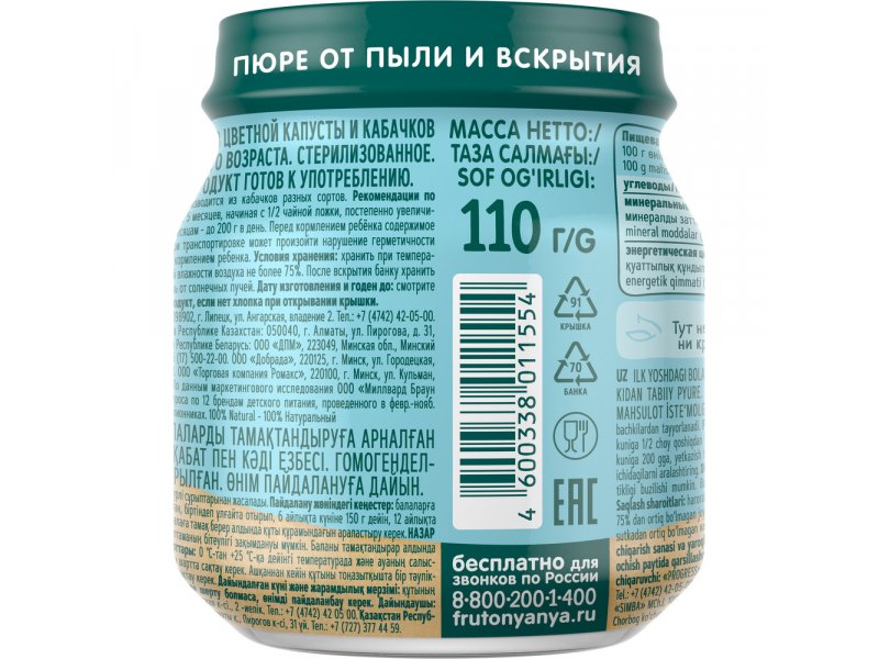 Пюре ФрутоНяня Цветная капуста и кабачок 110 г