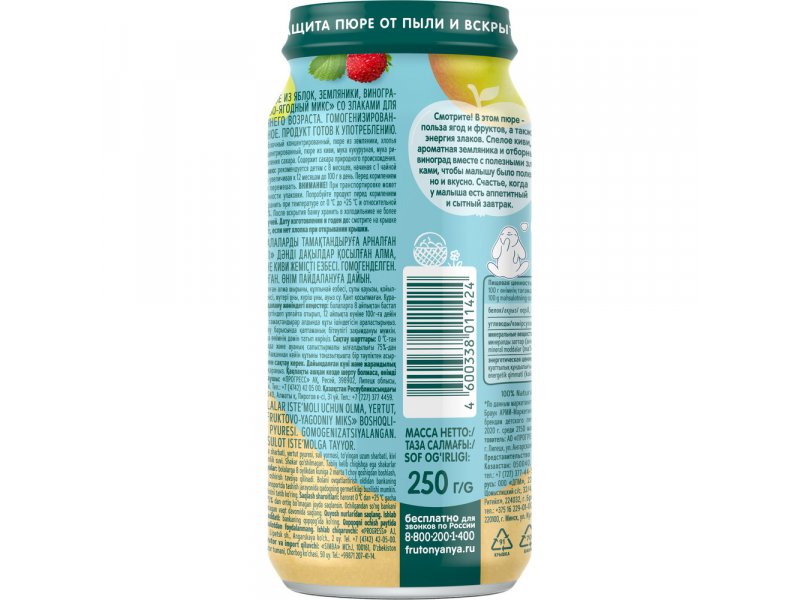 Пюре ФрутоНяня Фруктово-ягодный микс Яблоко, земляника, виноград, киви с мультизлаками 250 г
