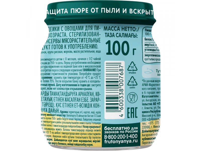 Пюре Фрутоняня индейка с овощами Полноценный обед, 100 г