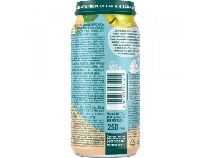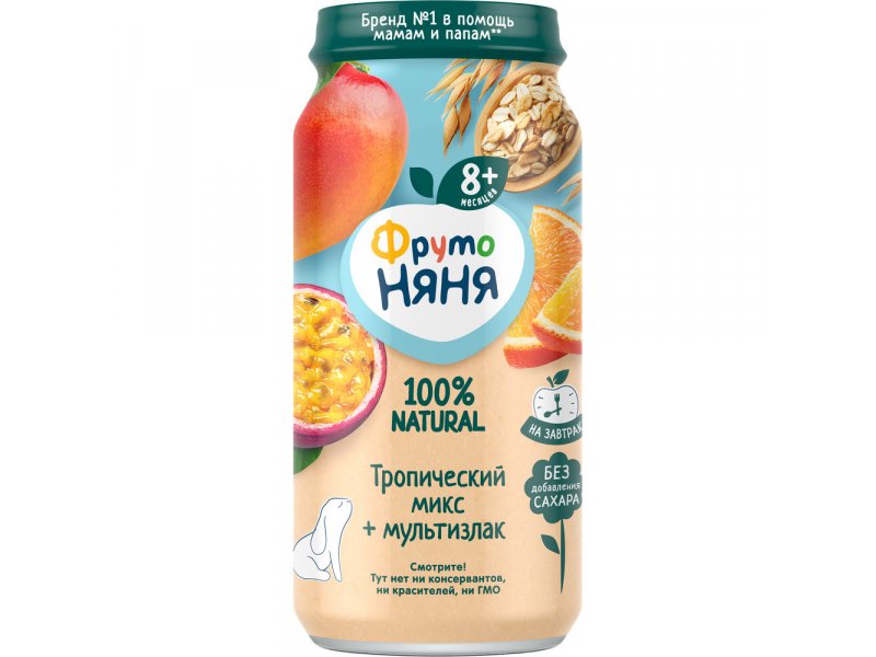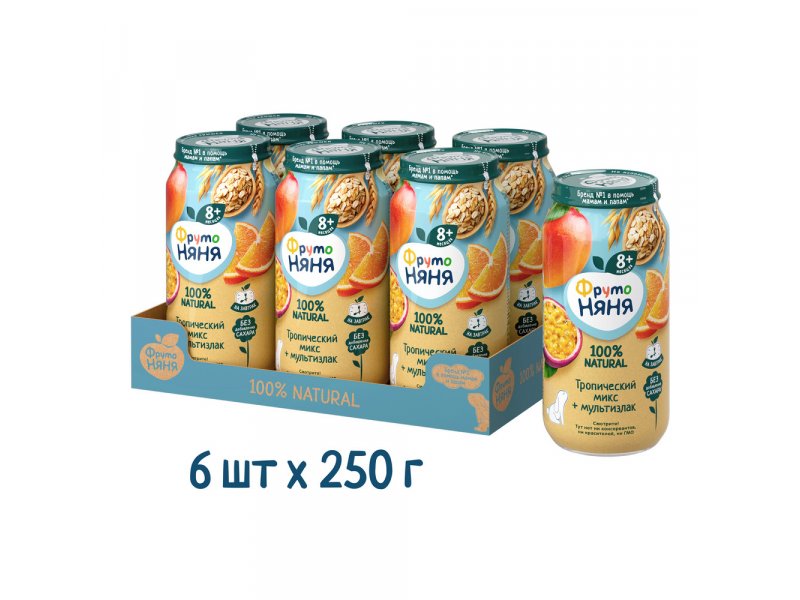 Пюре ФрутоНяня Тропический микс Яблоко, банан, манго, апельсин, маракуйя с мультизлаками 250 г