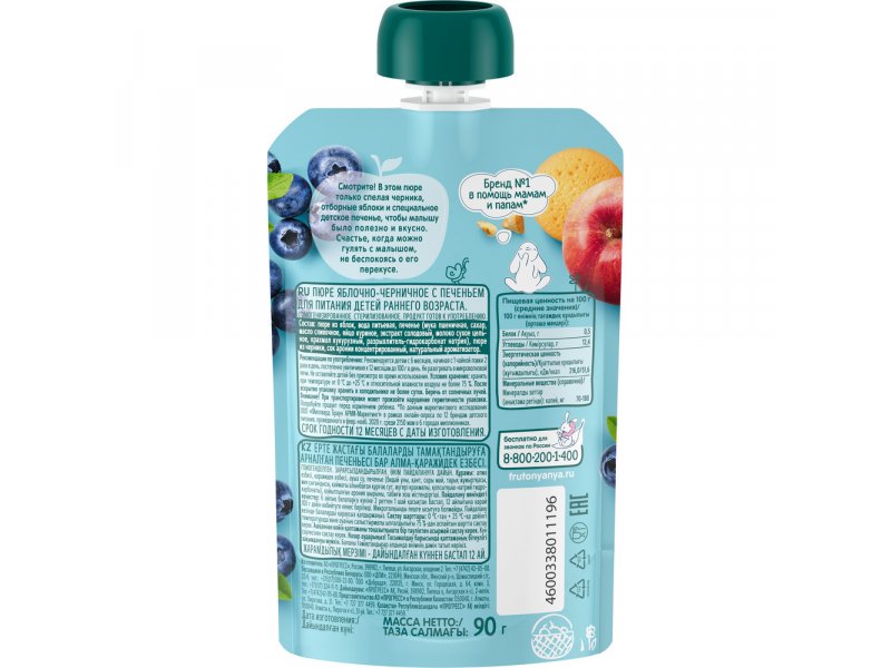 Пюре ФрутоНяня Яблоко и черника с печеньем 90 г дойпак