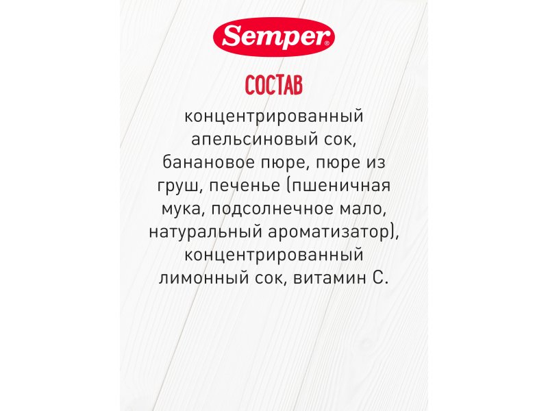Состав: концентрированный апельсиновый сок, банановое пюре, пюре из груш, печенье (пшеничная мука, подсолнечное масло, натуральный ароматизатор), концентрированный лимонный сок, витамин С.