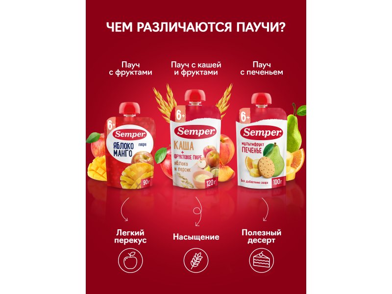 Пюре Semper в мягкой упаковке (пауч) — идеальный перекус для активных малышей. Оно не разольётся и не разобьётся, поэтому его удобно брать с собой на прогулку или в поездку.