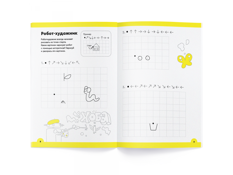 Секрет эффективности тетрадей Плавное усложнение. Именно поэтапное освоение темы — гарантия того, что ребенок не просто поймет, что такое алгоритмы, но и будет уметь ими пользоваться. Наглядное объяснение. Задания спроектированы так, что ребенок, решая их поочередно, самостоятельно разбирается с принципами работы алгоритмов. Задания с историей. Гораздо интереснее рисовать картины вместе с роботом-художником и помогать пчёлкам искать мед, чем просто решать однотипные задания.