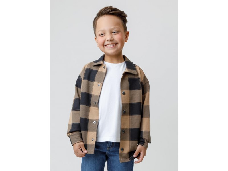 Свободная трикотажная рубашка для мальчика из мягкого петельчатого футера. Застёгивается на кнопки. Модель с закругленным низом и спущенным плечом. Рисунок в клетку выполнен из стойких текстильных гипоаллергенных красителей. Изделие сохраняет цвет и форму после многократных стирок. Все трикотажные полотна производятся в соответствии с нормами швейцарского сертификата ЭкоТекс. Состав: 100% хлопок. Ткань: Футер-петля
