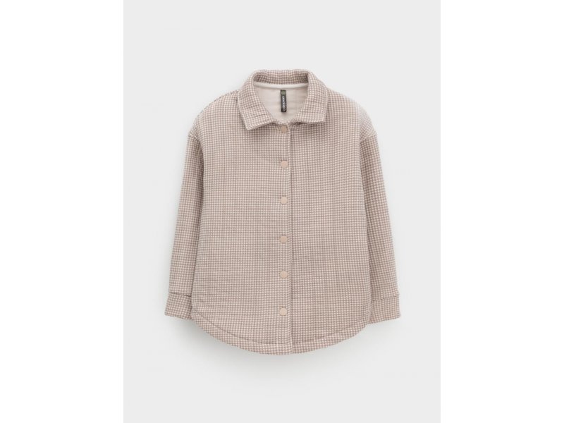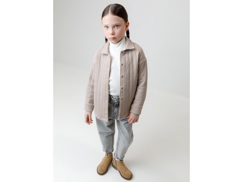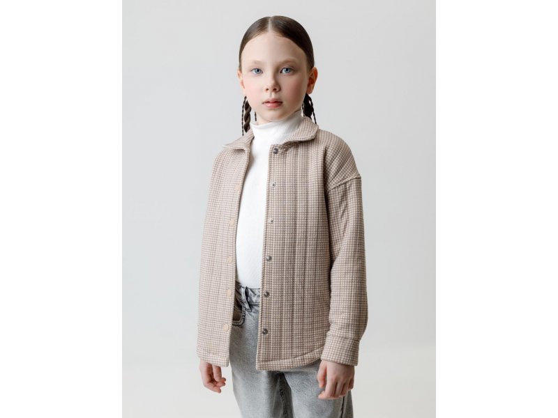 Тёплая рубашка свободного кроя для девочки из мягкого капитония. Капитоний – это стёганое трикотажное полотно с утеплителем из полиэстеровой нити. Модель с закругленным низом и спущенным плечом. Застёгивается на пуговицы. Рисунок в гусиную лапку выполнен из стойких текстильных гипоаллергенных красителей. Все трикотажные полотна производятся в соответствии с нормами швейцарского сертификата ЭкоТекс. Состав: 75% хлопок, 25% полиэстер. Ткань: Капитоний