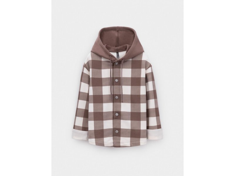 Свободная трикотажная рубашка для мальчика из мягкого петельчатого футера. В составе 80% натурального хлопка и 20% полиэстера, при этом полиэстер ввязан внутрь по особой технологии и не соприкасается с кожей. Застёгивается на кнопки. Модель с капюшоном и спущенным плечом. Рисунок в клетку выполнен из стойких текстильных гипоаллергенных красителей. Изделие сохраняет цвет и форму после многократных стирок. Все трикотажные полотна производятся в соответствии с нормами швейцарского сертификата ЭкоТекс.