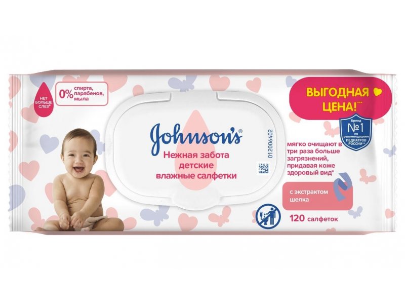 Применение: Используйте детские влажные салфетки «Нежная забота» Johnson's® для очищения кожи малыша в любое время и в любом месте – дома между купаниями, на прогулке или в поездке. Просто протрите ребенка очищающей салфеткой и обнимите малыша – ведь вам не нужно беспокоиться о смывании или вытирании кожи после применения. Выбросите салфетку после использования.