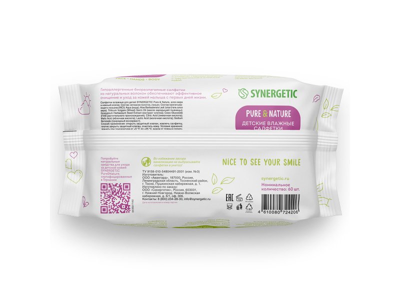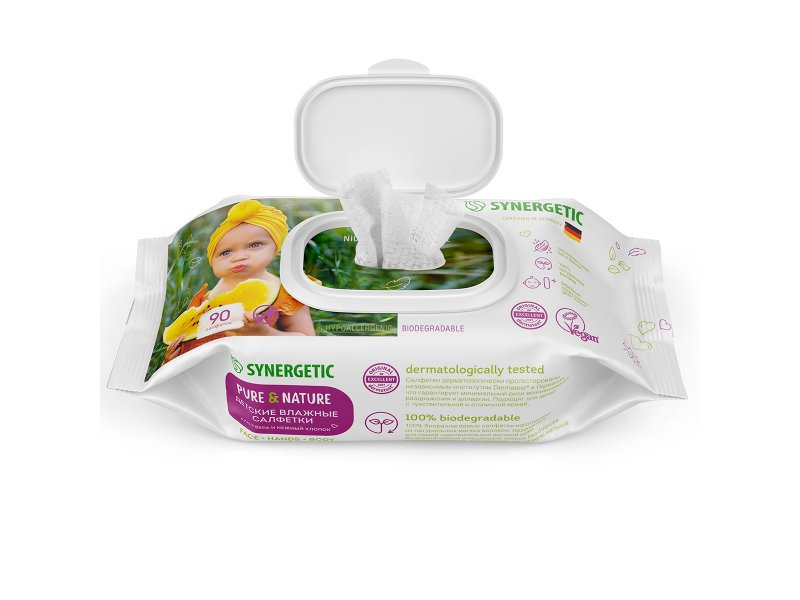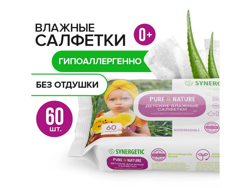 Гипоаллергенные биоразлагаемые салфетки SYNERGETIC Pure & Nature "Алоэ вера и нежный хлопок" из натуральных волокон эффективно очищают и ухаживают за кожей малыша с первых дней жизни.