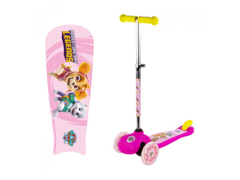 Легкий трехколесный самокат с грузоподъемностью до 20 кг оформлен в стиле мультфильма Щенячий патруль, обожаемого многими мальчиками и девочками. Руль из легкого алюминиевого сплава стильно смотрится с платформой из нейлона приятного розового цвета с декоративными надписями и картинками с изображением спасателей. Колеса разного диаметра, выполнены из PU, эффектно светятся в темноте. На заднем колесе - тормоз-крыло.
