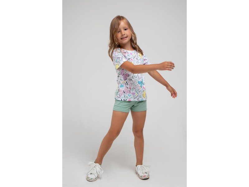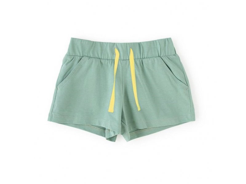 Лёгкие шорты с резинкой в поясе. Сшиты из однотонного трикотажа супрем в оттенке "пыльная мята". Пояс регулируется по ширине с помощью ленты. По бокам карманы. Низ обработан плоскими швами.